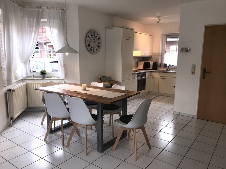 Erdgeschoss: Offener Wohn- und Essbereich mit Flachbild-TV. Küche mit gut ausgestatteter Einbauküche mit 4-Kochstellenherd mit Ceranfeld und Backofen, Kühlschrank, Spülmaschine, Microwelle, etc.. und ausreichend Töpfen, Besteck und Geschirr. Esstisch mit Bestuhlung.