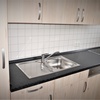 Kühlschrank, Geschirrspüler, Geschirreinrichtung, Elektroherd, Tiefkühlfach, Mikrowelle, Wasserkocher, Kaffeemaschine, Toaster, Eierkocher, Besteck, Gläser