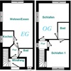 Im Erdgeschoss befinden sich ein großes Wohnesszimmer mit Zugang zur Terrasse, die Küche und ein Duschbad. Im Obergeschoss sind zwei Schlafzimmer mit jeweils einem Doppelbett (4 Schlafgelegenheiten) sowie einem Kinderbett vorhanden. Außerdem gibt es hier ein zweites Duschbad.