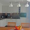 Kühlschrank, Geschirrspüler, Geschirreinrichtung, Elektroherd, Tiefkühlfach, Mikrowelle, Wasserkocher, Kaffeemaschine, Toaster, Besteck, Gläser