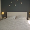 Ein Schlafzimmer mit Doppelbett und zusätzlichem Flachbild-TV.