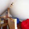 Im zweiten Schlafzimmer, das Sie vom Wohnzimmer aus über eine Treppe erreichen, befinden sich zwei Einzelbetten. Dieses Dachgeschoss besitzt ein großes Panoramafenster mit einem schönen Blick über die Dünen bis zum Meer. Fenster und Treppe sind kindgerecht sicherbar.