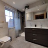 Bad mit Dusche, Doppelwaschtisch mit Schubladenschrank, Spiegelschrank, Toilette, Föhn, Schminkspiegel