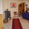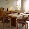 Grosszügiges und gemütliches Wohnzimmer und Esszimmer mit Kaminofen und FlachbildTV, grossem Esstisch und Balkon in Südlage mit Echtholzmöbeln.