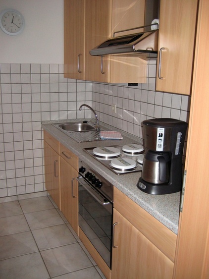 Kühlschrank, Geschirrspüler, Geschirreinrichtung, Elektroherd, Tiefkühlfach, Mikrowelle, Wasserkocher, Kaffeemaschine, Toaster, Eierkocher, Besteck, Gläser