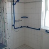 Badezimmer mit ebenerdiger befahrbarer Dusche und Duschhocker mit Armlehnen, WC mit Haltegriffen, unterfahrbares Waschbecken mit Kippspiegel. Fußbodenerwärmung. Waschmaschine.