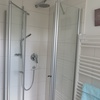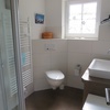 Das Badezimmer ist ausgestattet mit einem grossen Waschtisch, diversen Ablagen, einem WC mit automatischer Abluftabsaugung, und einer grossen Dusche mit Handbrause und einer Regenwalddusche. Eine Fussbodenerwärmung sorgt für warme Füsse. Das Warmwasser und auch für die Küche wird von einem elektronischen Durchlauferhitzer erzeugt.