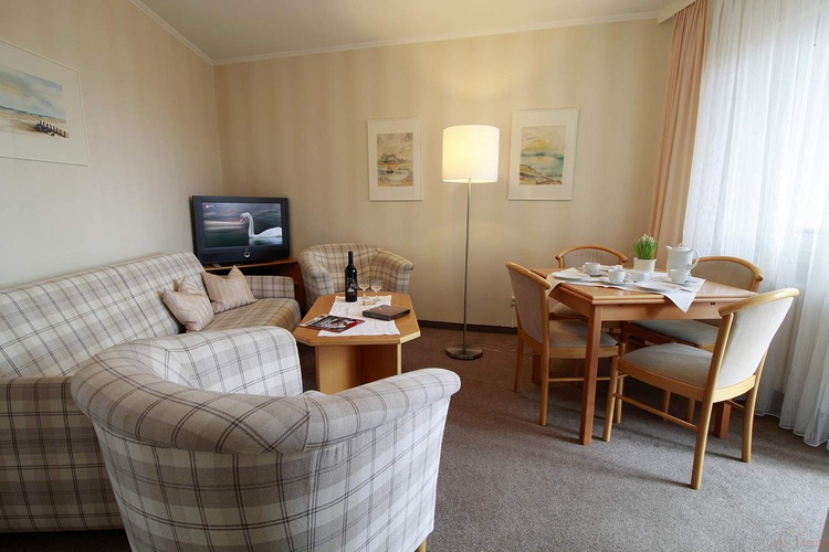 - Wohnzimmer: 2-Personen-Verwandlungssofa, 2 Sessel, Esstisch, HD-Kabel-TV