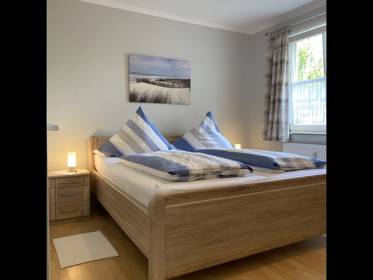 Im geräumigen Schlafzimmer befindet sich ein seniorengerechtes komfortables Bett.