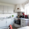 Kühlschrank, Geschirrspüler, Geschirreinrichtung, Elektroherd, Tiefkühlfach, Mikrowelle, Wasserkocher, Kaffeemaschine, Toaster, Besteck, Gläser