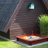Am Strand stehen viele Spielgeräte, Sandkasten etc.
