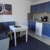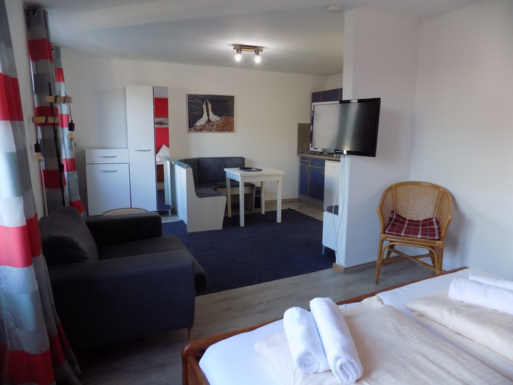 Junior Suite für 2 Personen, Einraumappartement mit Schlaf- und Wohnbereich, 2 Balkone mit seitl. Meerblick, helles großes Bad, Küchenzeile; Teeküche mit Backofen und 4-Platten-Herd (EG), WLAN