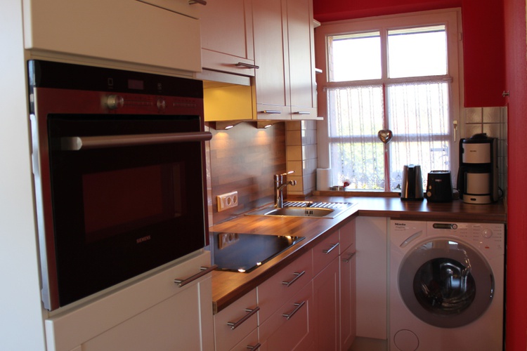 Kühlschrank, Geschirrspüler, Geschirreinrichtung, Elektroherd, Tiefkühlfach, Mikrowelle, Wasserkocher, Kaffeemaschine, Toaster, Eierkocher, Besteck, Gläser